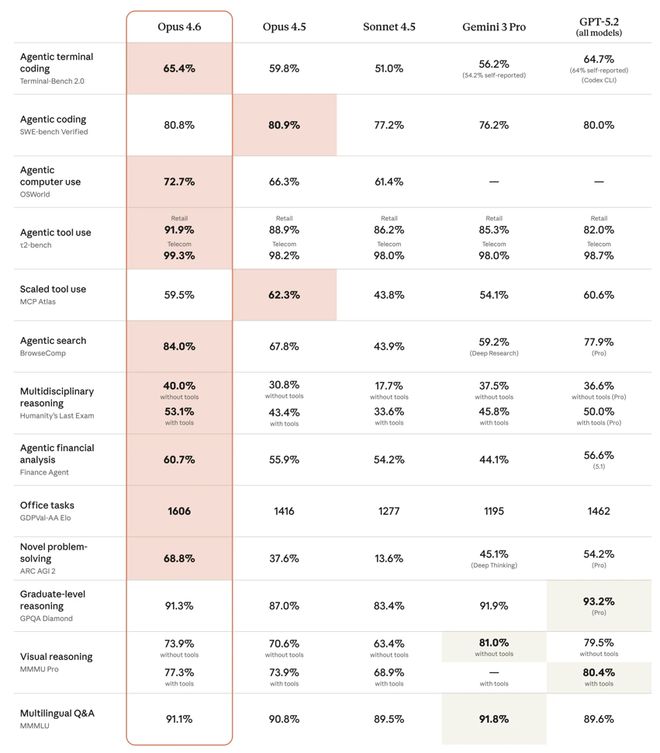 同期在金融分析、研讨机使用、用具使用、检索和代理式编程的专项测试中,Opus 4.6亦然行业杰出的模子。