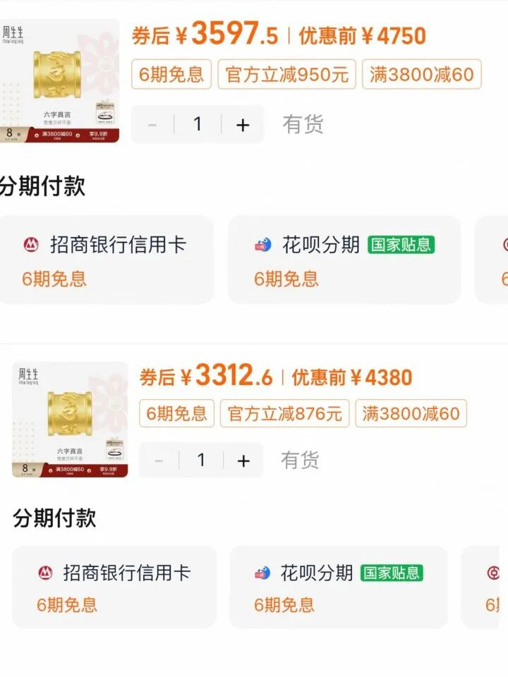 六字真言款原价4750元,折后约3597元;11日原价降至4380元,折后3312元,降了近300元。