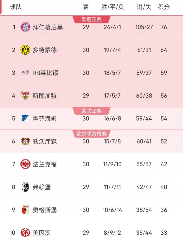 4月19日德甲联赛第30轮比赛,莱比锡3-1慑服法兰克福,奥格斯堡2-1爆冷慑服勒沃库森,霍芬海姆2-1爆冷慑服多特蒙德,狼堡2-1慑服柏林相关,德甲积分出炉!拜仁76分以12分上风不时领跑,多特蒙德64分次席,莱比锡59分第三,斯图加特56分升第四,霍芬海姆54分第5,勒沃库森53.2分第六,