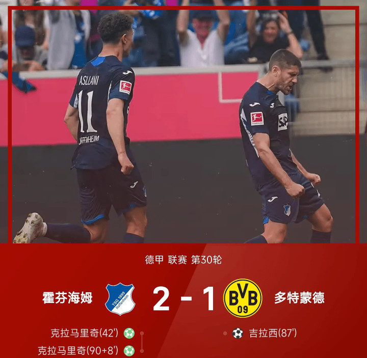 25/26赛季德甲联赛第30轮,霍芬海姆2-1慑服多特蒙德。上半场比赛,聚勒禁区内滑倒受伤的同期手球送点,克拉马里奇主罚掷中。下半场易边再战,吉拉西替补登场在弧顶远射破门扳平比分,但临了时分雷尔森也手球送点,克拉马里奇主罚掷中,最终匡助霍芬海姆重回胜轨。
