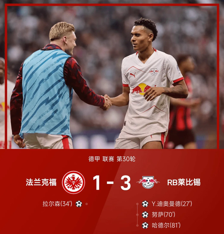 25/26赛季德甲联赛第30轮,RB莱比锡3-1慑服法兰克福。迪奥曼德开场第27分钟考订法兰克福后防立功,拉尔森破门扳平;易边再战,努萨个东说念主才调内切破门再度获得跳跃,第81分钟努萨再送直塞助攻哈德尔破门锁定胜局。莱比锡赛季双杀法兰克福。