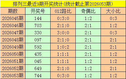 二、体彩摆设三前9期奖号开出:144-703-330-097-592-435-045-649-744,其中奖号大小比为10:17,012路比为12:11:4,奇偶比为14:13;