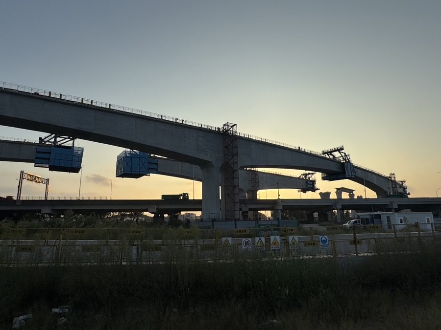 这次施工的右线贯串刚构,主跨长达158米,澄清转弯半径800米,施工难度大、安全管控条目高。梁体共分为81个节段,结构高度约5到10米,单侧悬臂浇筑19个节段,最长节段长约4.5米,最大节段重约185吨。
