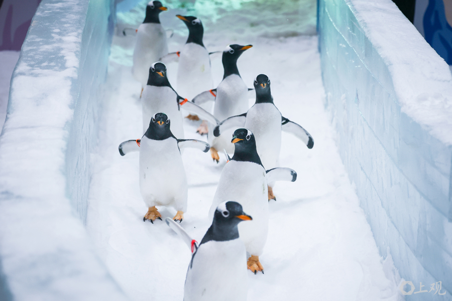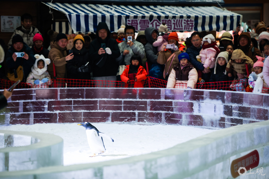 2026年元旦技巧,耀雪冰雪世界引入的一批南极巴布亚企鹅与旅客碰头,进行南极巴布亚企鹅巡游首秀。