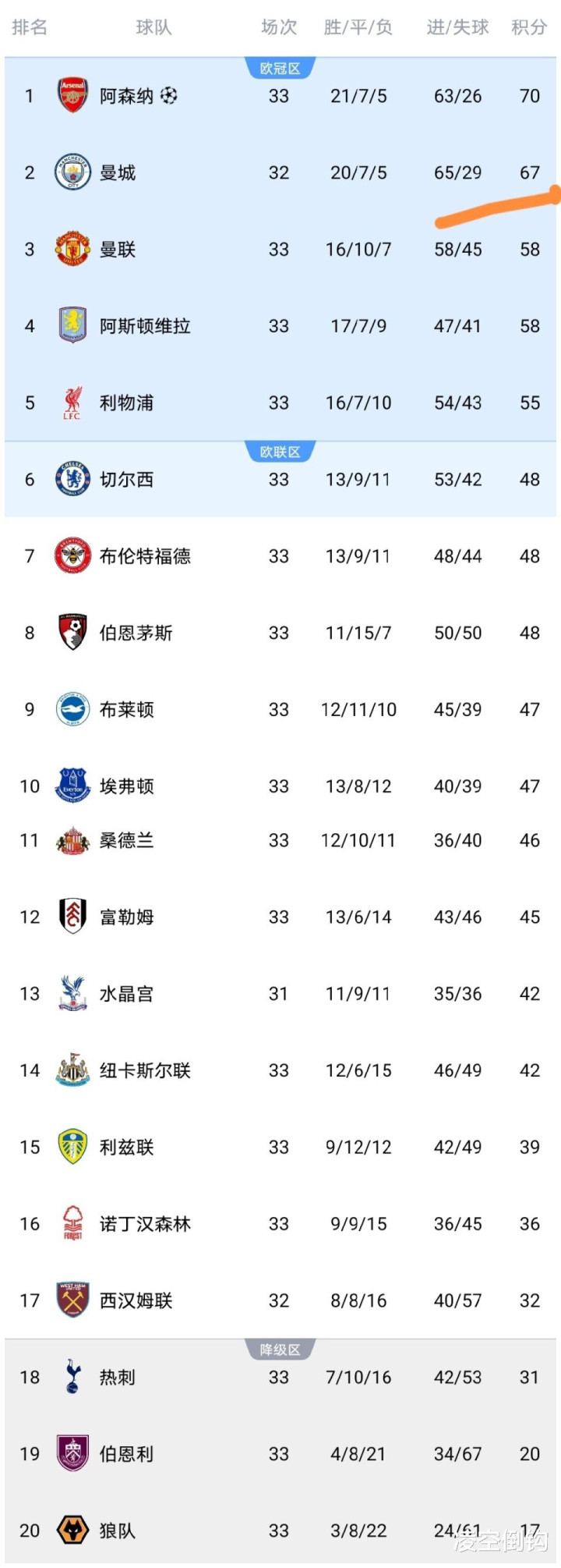 不错看到曼城比阿森纳少赛一场,积分高涨到了67分,濒临阿森纳。