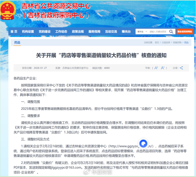 据核查见知,关连药品坐蓐企业需在2026年2月2日16时前,通过吉林省寰球资源来回中心药械招采子系统,主动央求挽回药品挂网价钱,将挂网价挽回至零卖渠谈众数价的1.3倍以内,杀青价钱合理总结。对零卖渠谈“众数价”有疑义的企业,可在归并时辰节点前,提错杂盖企业公章的解释材料和法定代表东谈主授权书,发送至指定邮箱进行陈述。