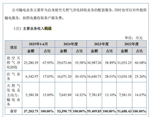 凯龙洁能主营油气田放空自然气净化回收、注气业务及自然气发电职业等,其中放空自然气净化回收业务收入占比长年卓绝50%,是整个的中枢支握。