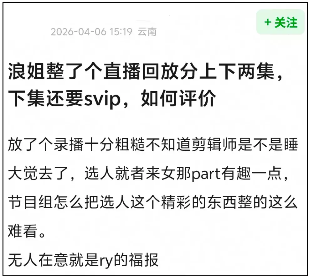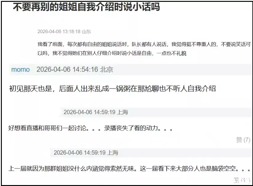 不啻一位网友对《浪姐7》改变不雅看形态抒发了不悦,吐槽节目组吃相丢脸。