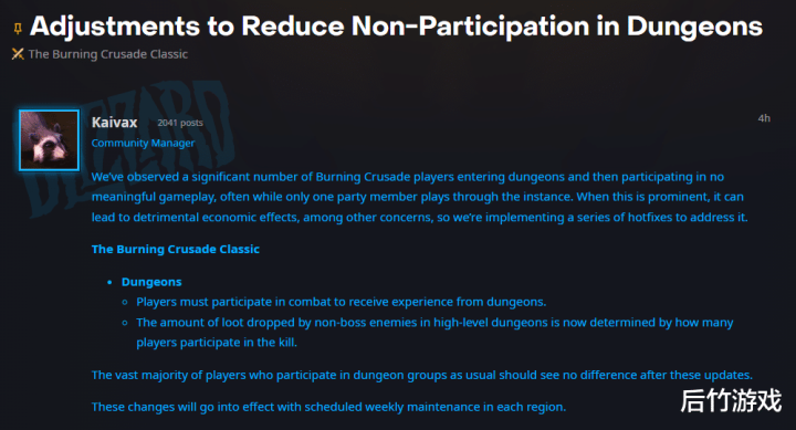 恰当到许多TBC的玩家在插足地下城后并未施行故真理的操作,戎行频繁唯唯一东谈主在打怪。如若这种情况无数存在,将导致严重的经济和其他问题,因此出台热修。