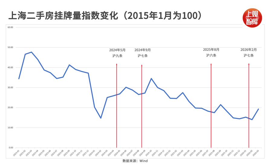 数据裸露,上海二手房挂牌量从2020年末急速下落,2024年战略出台时,战略利好让房主们产生“试试水温”的试探性挂出;2025年“沪六条”后,“卖旧换新”的置换需求再次让挂牌量上升;2026年“沪七条”后,二手房市集来回火爆,相应地挂牌量也连忙抬升。